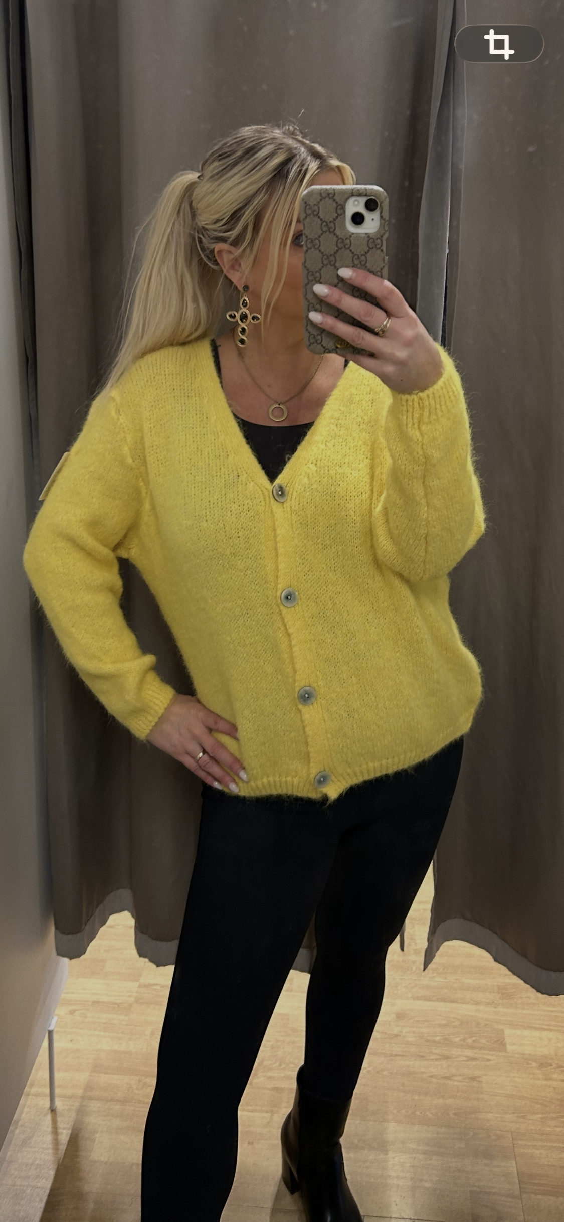 Polyester,ull,nylon, spandex. Ein stærð ca 38/46